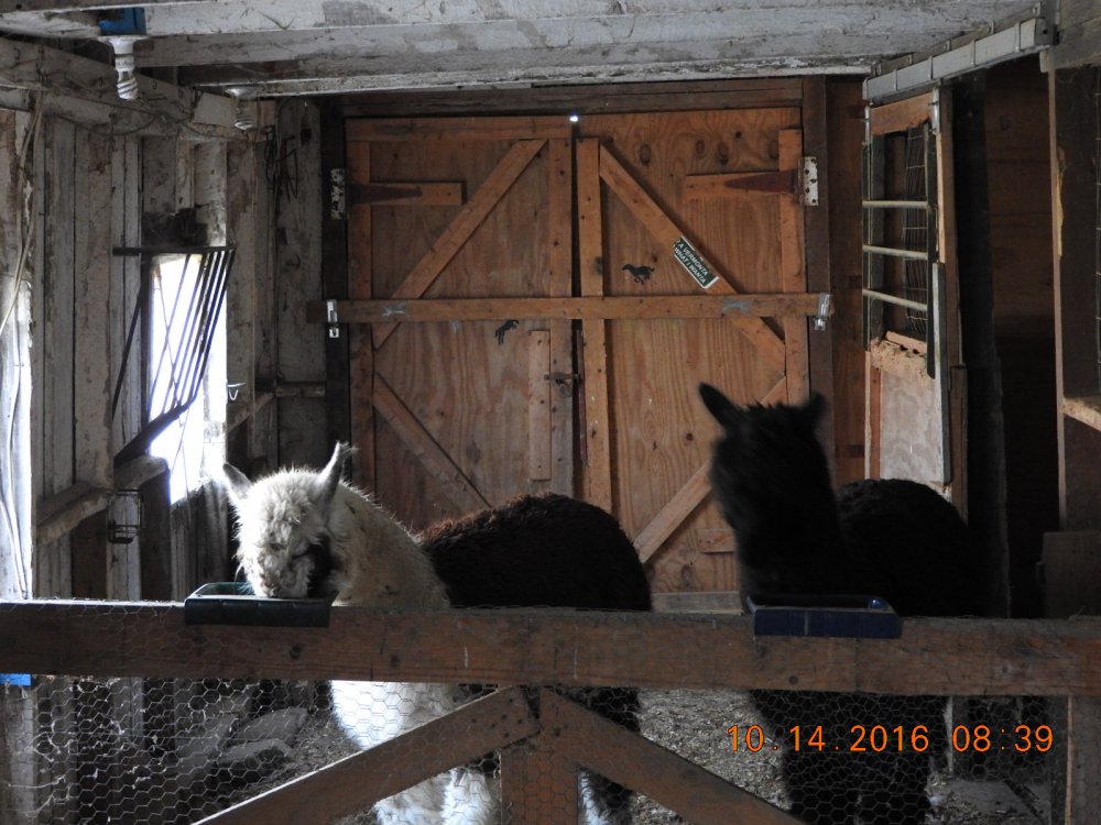 Went out this morning expecting the usual routine. Say hi to the boys in the field, open the barn, toss kitchen scraps for the chickens after they rush out, go get BOSS for them and pellets for the alpacas, go back out, toss the BOSS, hand feed the alpacas at the gate.