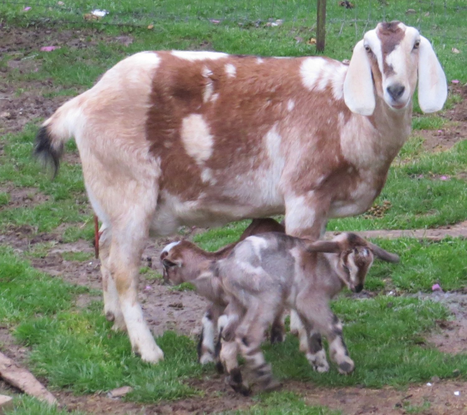 Wanda had two doelings! Born 2/20/2021. Daddy is the young Nigerian dwarf.I recently checked Wanda, and her udder is filling, which indicates that the little male managed to breed her. He's IMG_1043 on the Feb. 4 post but mostly grown up now. Attached is a picture I took the day they bred. I noticed my goats tend to sit next to each other after mating.View attachment 80263