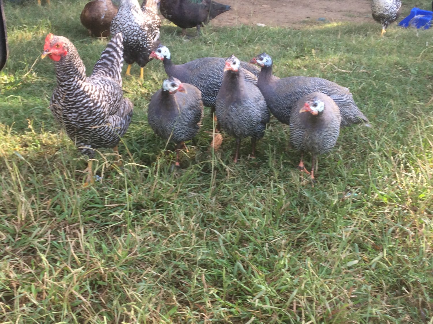 and just because I think its so cute i'm including a picture of the guineas and the barred rock pullet they think is their mama. she has no clue that shes suppose to be their mom but they follow her everywhere.