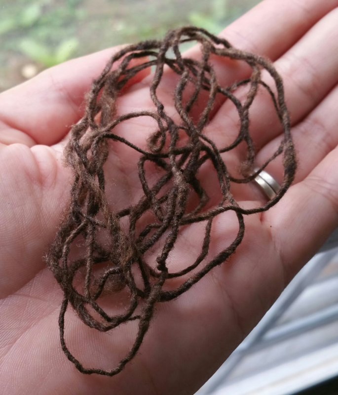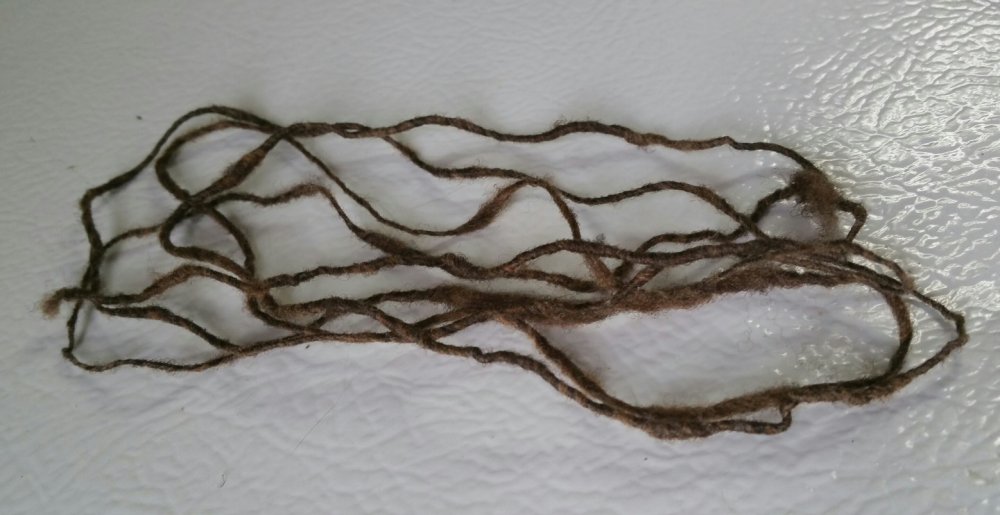 Cool wool! Congrats on getting featured on the homepage!My first drop spindle shows up tomorrow, attempted some yarn making on random objects. Made my own from wire and a cup to test if I was even able to make it, that's the curled one. It set, yay, so ordered a proper spindle. Then I got bored this morning waiting on the needles to show, so I used a 1/2" cpvc pipe to make some more. Used the AC unit to dry it. Turned out much better.