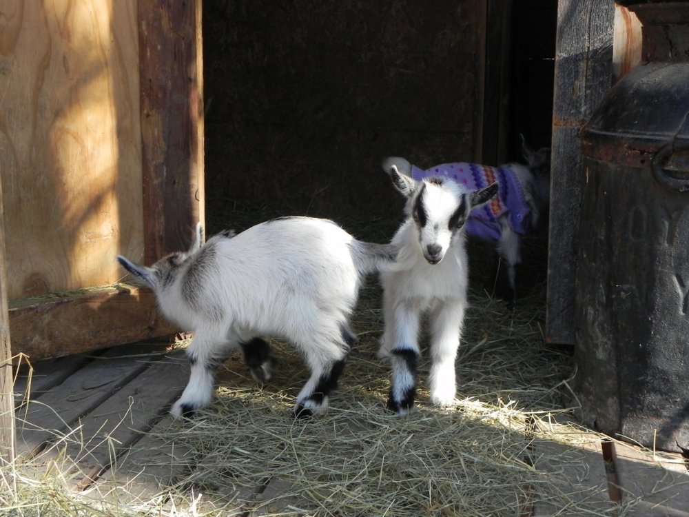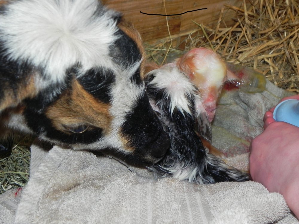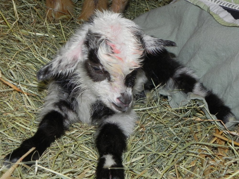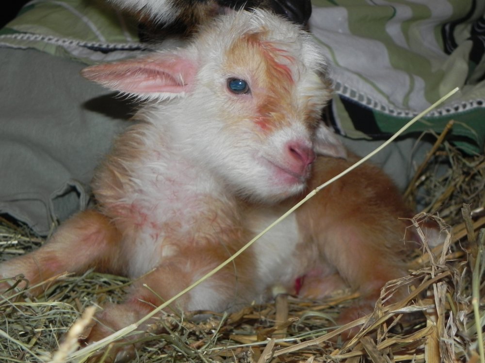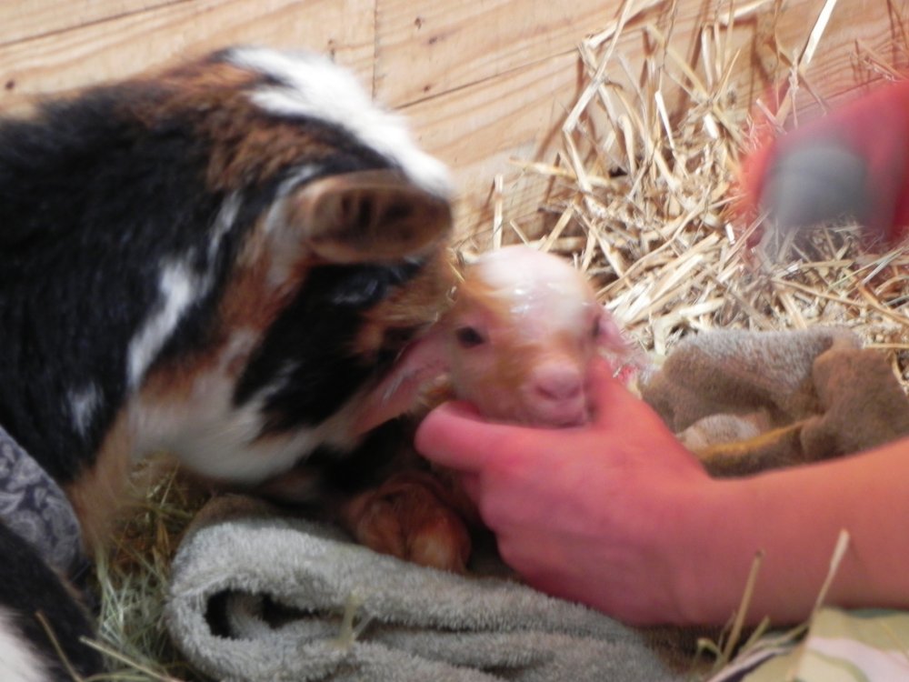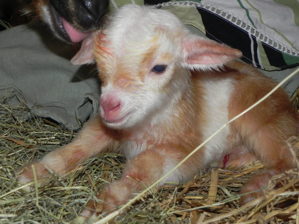 Alley Kat kidded!! I can hardly believe how fast labor and kidding went. She was like a pro! She had twin bucks. The gold one was born first, then then the black and white one. They are so flashy; one looks just like his daddy (the gold one) and the other, more like his mama!!! They are so adorable!!! :love