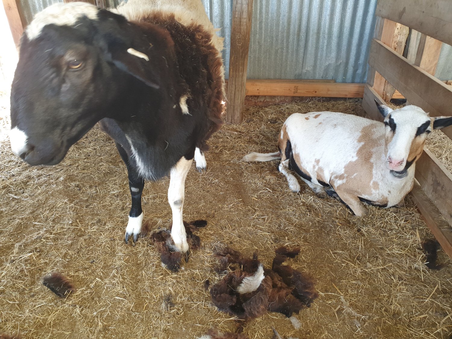 The brown ewe is Pinto, daughter of Ewenique and Ringo. Perfect hair coat!