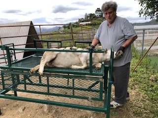 There is another piece of equipment I am saving for which is similar to the squeeze but instead of tilting is constructed to give you room to work on the sheep at a comfortable height for trimming hooves, AI, and other medical and grooming needs.