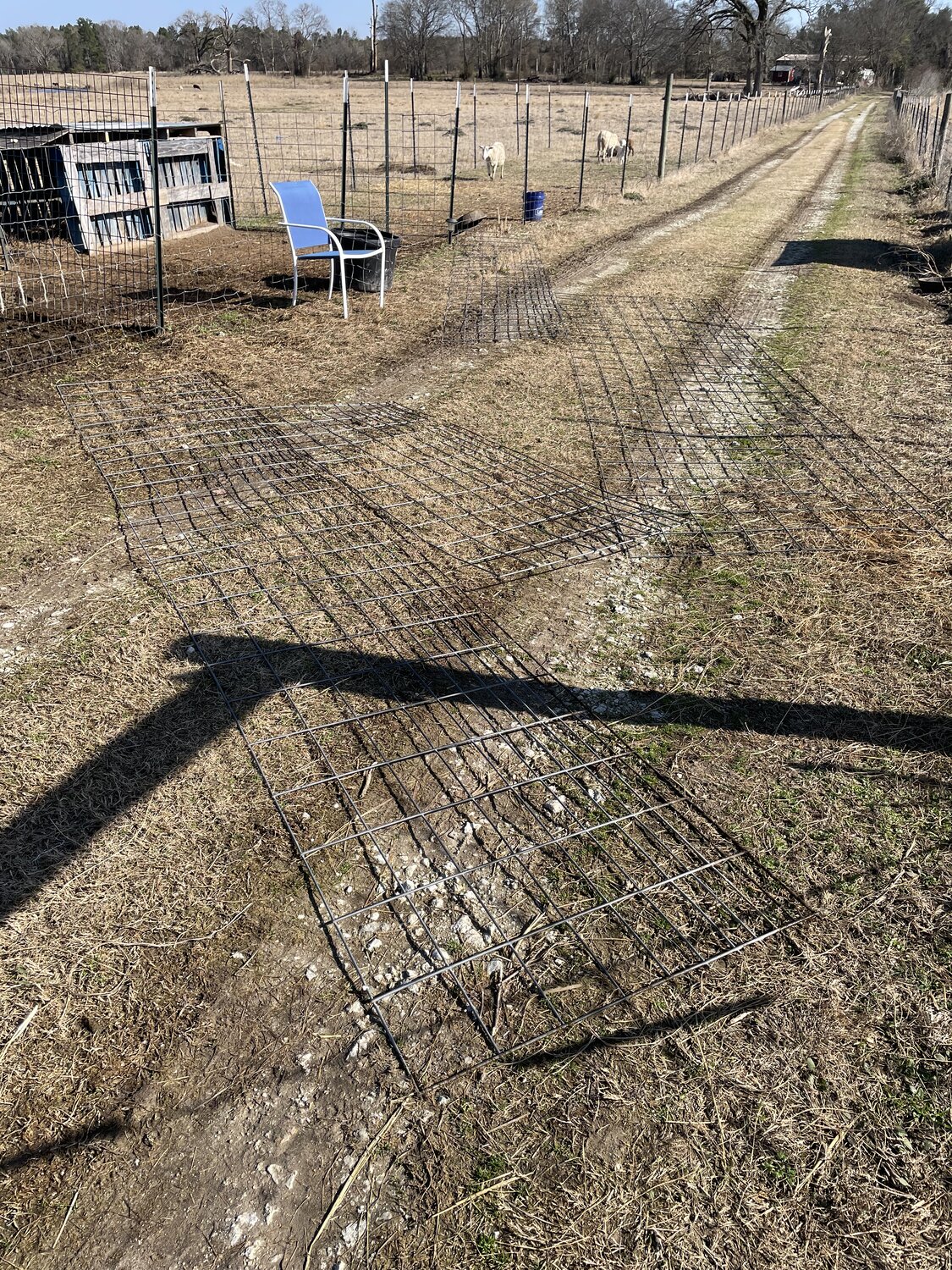I rolled it up, tied with hay string and carried it to the sheep pen. I wrapped the end around the T-post on the end and wired it in place. I pulled it to the gate opening, stood the wire up and it was sagging. Hmmmm……. I have a come along, but didn’t want to go through all that rigamarole to get it out, hook it up, blah, blah, blah. I wove a rusty piece of pipe through the wire, looped some hay string around the trailer hitch on the mule and tied the ends to the rusty pipe. I eased the mule forward and broke the hay string. Backed up, tied a new knot in the darned hay string and tried again, reminding myself this ain’t a come along, it’s a sh!t tool for a craptastic job.