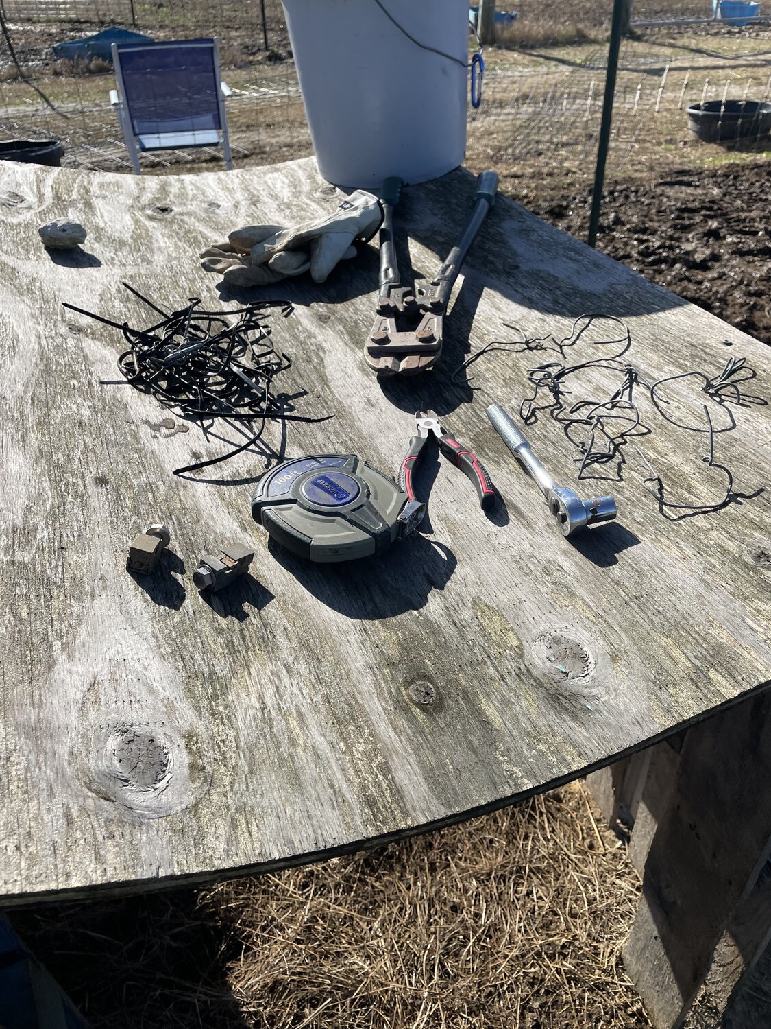 I laid the measuring tape down and cut it with long handled bolt cutters. I love my bolt cutters. No puny little wire cutters for me! No struggling to cut the wire, no sore hands from squeezing as hard as I can, nope. Bolt cutters are freakin awesome!