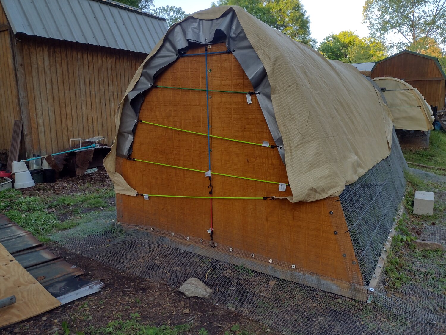 My DS came through, helped me place the tarp on top. I'd gotten a 16'x12', folded it in half, so there's a double thickness over the roost area. All the grommets on the sides were zip-tied. Then he helped me place a shade cloth over the whole coop. I put holes in the cloth just above the hem, ran zip-ties through and snugged it to the cattle panels, after pulling it taut.