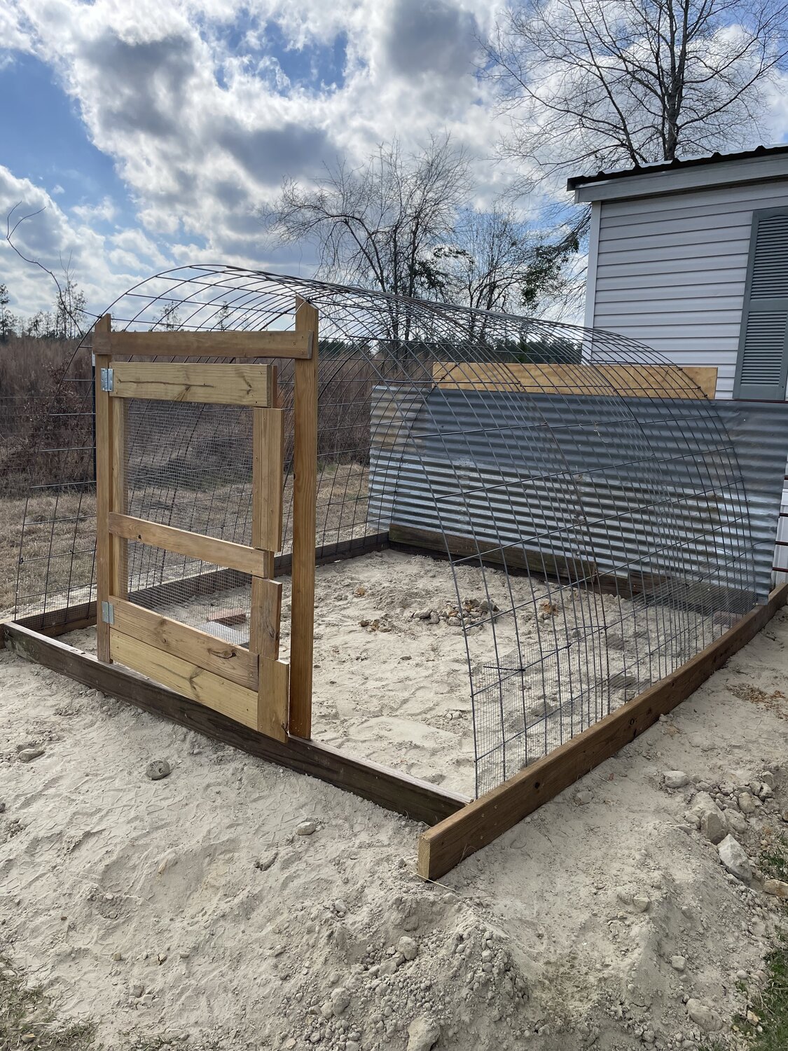 I finished the back of the coop. I didn’t cut the boards to fit the curve because I’ll take this down, so it doesn’t have to be perfect.