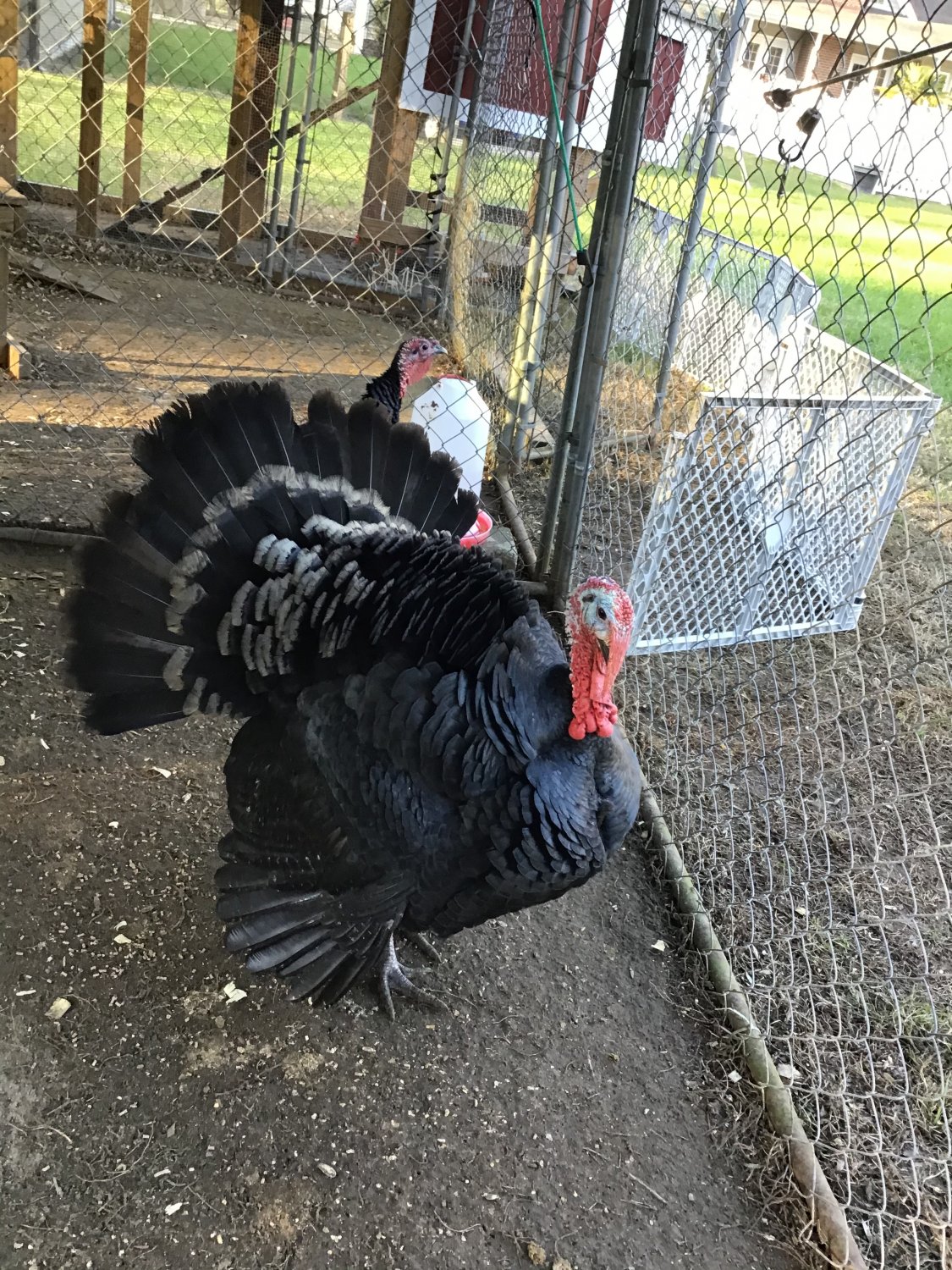 Hattie and Viddy free-ranging out in the back yard. Excuse the goat pen in the backView attachment 86271Picasso spreading out that big fan of his
