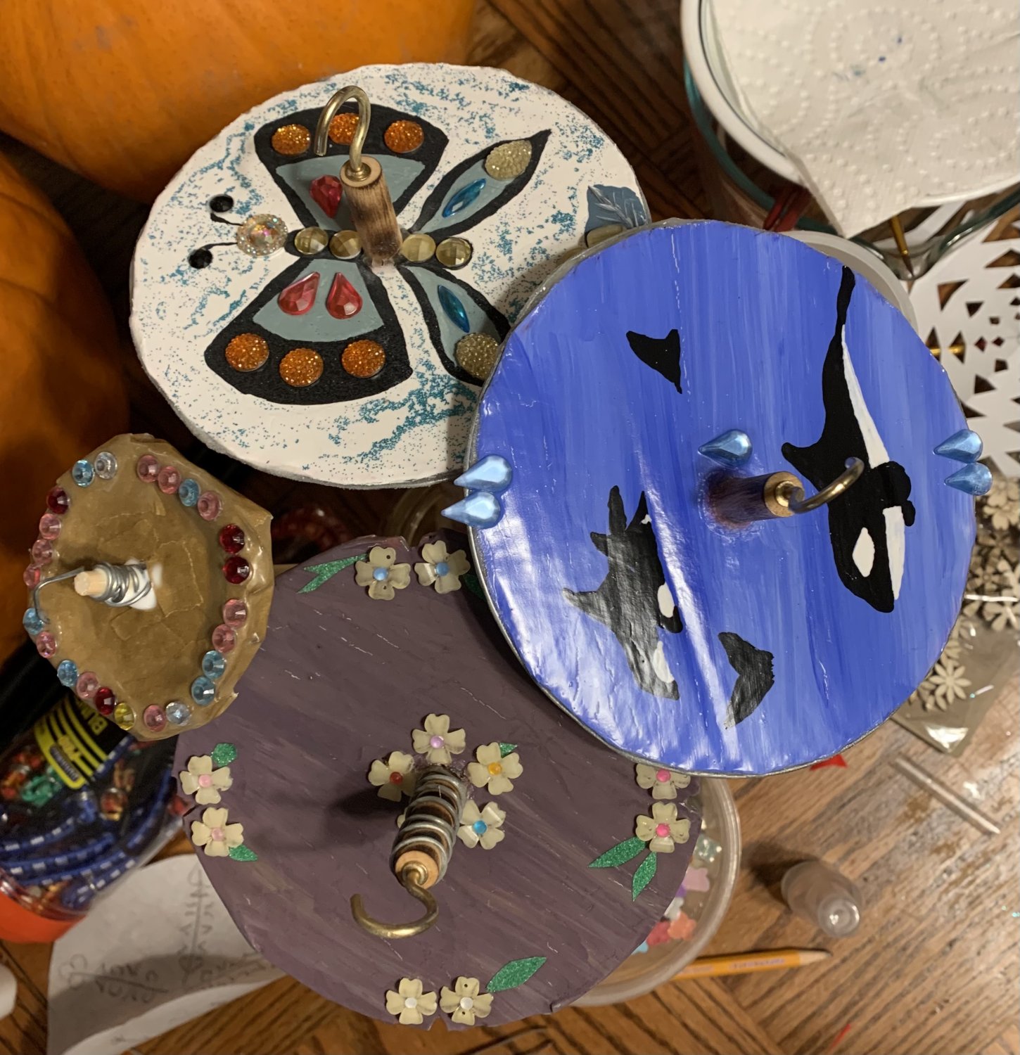 Completely designed, painted, and bejewelled by DH and myself. It’s actually pretty fun, but extremely time consuming. Between supplies, making them, and processing the wool, I have no idea what they’re worth!