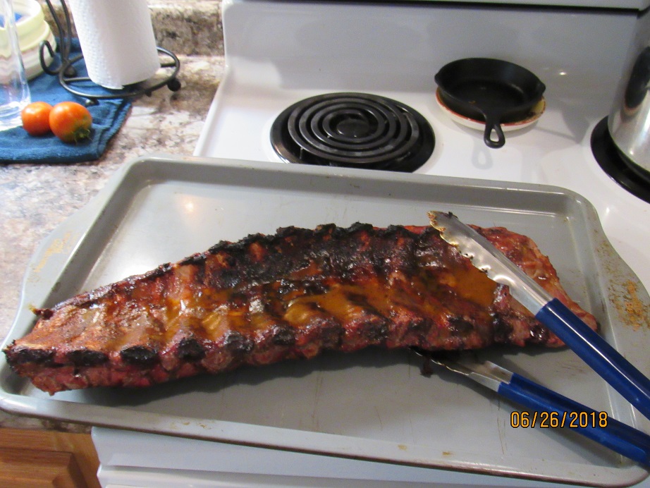 I have a very expensive smoker that does ribs perfectly and with no effort but it takes 5 hours. When I got done feeding everyone this evening I remembered I had a rack of Baby Back ribs in the fridge that I meant to put on earlier but since I had forgotten, I fired up the Weber. These weren't as tender as the slow smoke on the Traeger but they were every bit as tasty with some of my Sweet and Tangy Sauce brushed on.