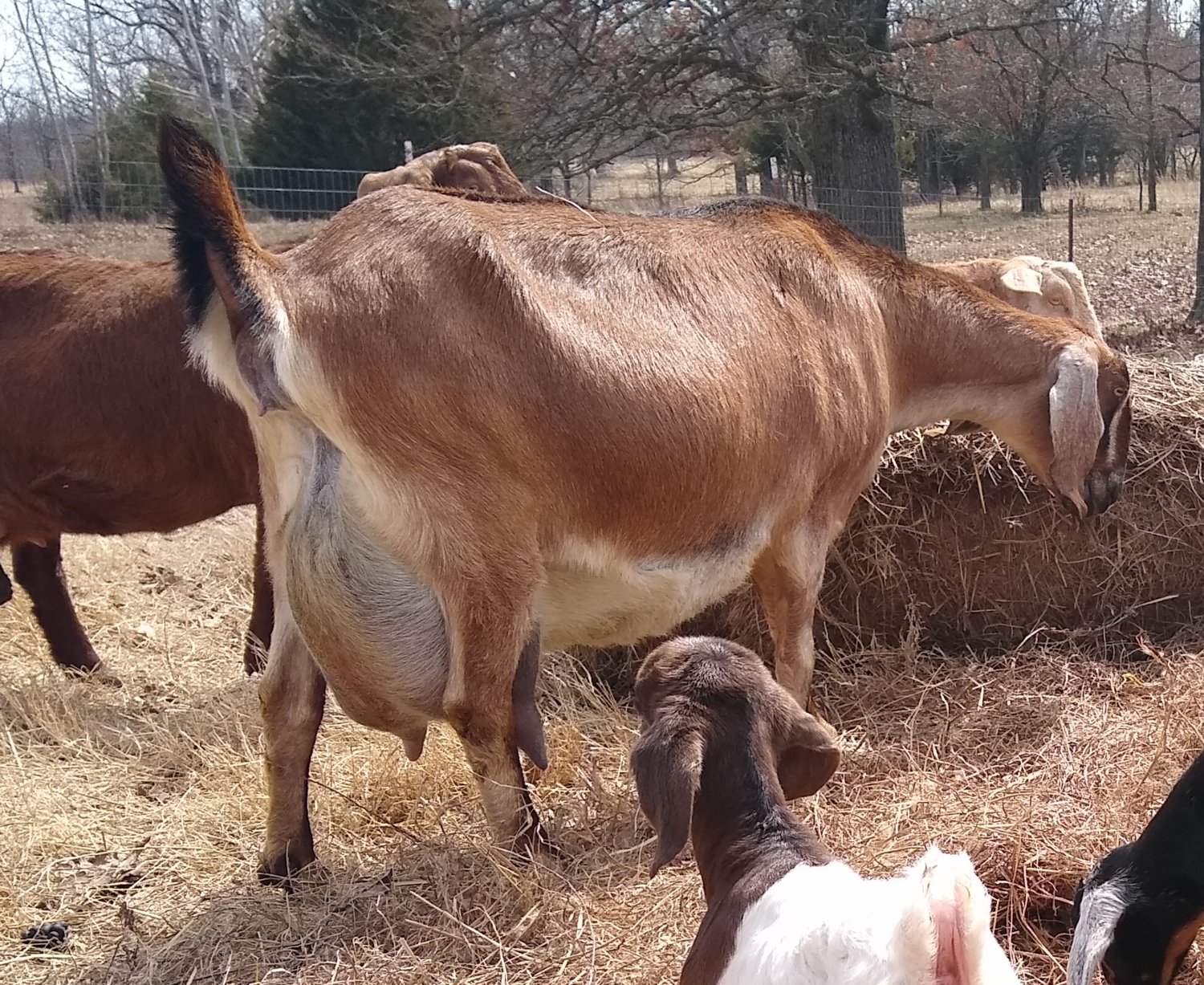 She milks a ton for a Nubian. I got her post mastitis from an older lady. I wish I could have gotten her before who knows how much she milked. She still milks 10 lbs out of half an udder (the one side only gives about 10-15 squirts a milking after you get the pre kidding build up out.Looks like she could feed a small army!